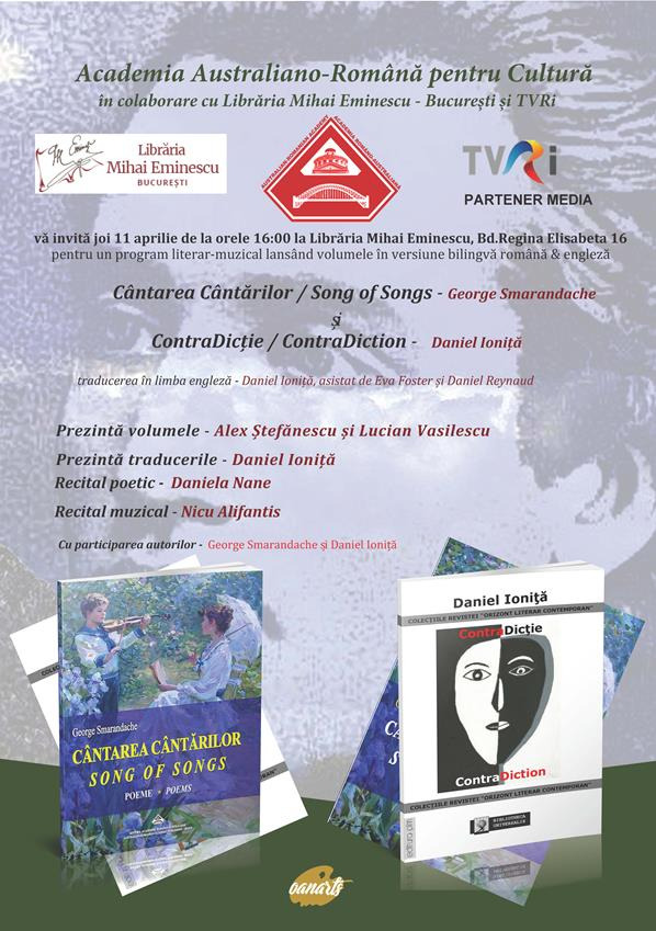 Joi, 11 aprilie 2019, incepand cu ora 16,00, va invitam la un program literar- muzical in care vor fi lansate volumele in editie bilingva romana- engleza: Cantarea Cantarilor de George Smarandache si ContraDictie de Daniel Ionita.