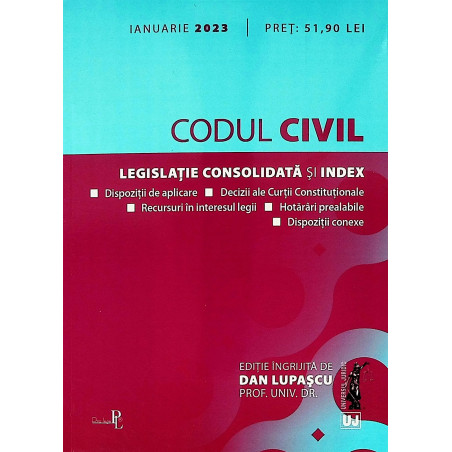 Editia a 17-a (revizuita) a lucrarii, Codul civil: ianuarie 2023, ingrijita de prof. univ. dr. Dan Lupascu si tiparita pe hartie alba de calitate superioara, contine textul Codului civil (cu modificarile substantiale aduse prin Legea nr. 140/2022 privind unele masuri de ocrotire pentru persoanele cu dizabilitati intelectuale si psihosociale), imbogatit cu dispozitii de aplicare si conexe, cu extrase din Constitutia Romaniei, cu decizii CNA, cu recursuri in interesul legii, cu hotarari prealabile si cu decizii ale Curtii Constitutionale, necesare unei depline intelegeri a reglementarii.
