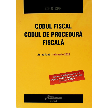 Volumul Codul fiscal. Codul de procedura fiscala reuneste cele doua acte normative de baza in materia fiscalitatii, actualizate cu modificarile si completarile la zi. Textele codurilor sunt corelate cu intreaga legislatie conexa, prin indicarea la nivelul fiecarui articol a ordinelor care contin instructiuni si proceduri de aplicare emise de Ministerul Finantelor Publice, de Agentia Nationala de Administrare Fiscala sau de alte autoritati cu atributii de reglementare in domeniu.