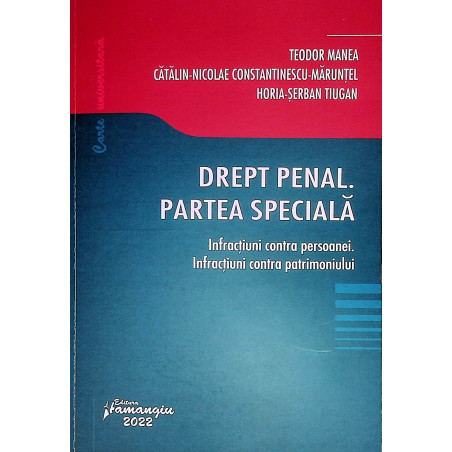 Drept penal. Partea speciala. Infractiuni contra persoanei. Infractiuni contra patrimoniului este un curs complex care trateaza o parte din infractiunile reglementate in partea speciala a Codului penal, care se gasesc in programa de studiu a facultatilor de drept. Analiza fiecarei infractiuni in parte este completata, spre o mai buna intelegere, cu exemple relevante din jurisprudenta.