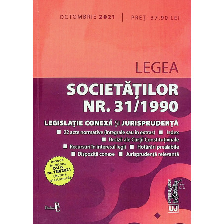 Editia a 7-a (revizuita) a culegerii, Legea societatilor nr. 31/1990, legislatie conexa si jurisprudenta: octombrie 2021, cuprinde dispozitiile Legii nr. 31/1990 actualizate (cu ultimele modificari aduse prin Legea nr. 206/2021), incluzand decizii ale Curtii Constitutionale, decizii de admitere a recursurilor in interesul legii, hotarari prealabile, denumiri marginale ajutatoare, index, note redactionale, scurte extrase relevante din legi incidente si jurisprudenta relevanta, in vederea crearii unui instrument cat mai eficient si mai usor de utilizat de catre practicieni, dar si de catre publicul larg.